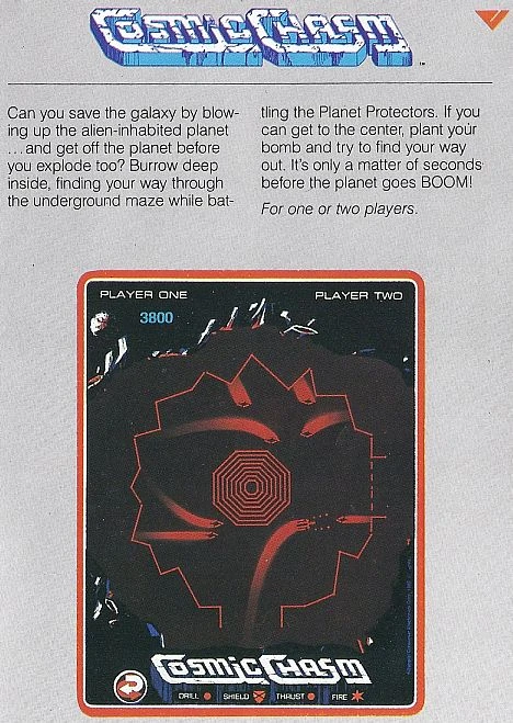 Cosmic Chasm was a game where players had to guide their ship through a series of mazes in order to destroy the central core. It was originally released for the Vectrex, but then was ported to the arcade through Cinematronics.